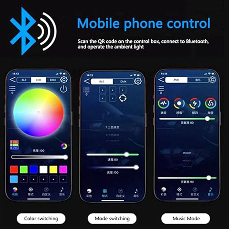 BLUETOOTH AND REMOTE DUAL CONTROL: Easily manage your car's interior LED lights through the included remote control or a Bluetooth-connected app, offering seamless customization for color, brightness, and lighting modes.